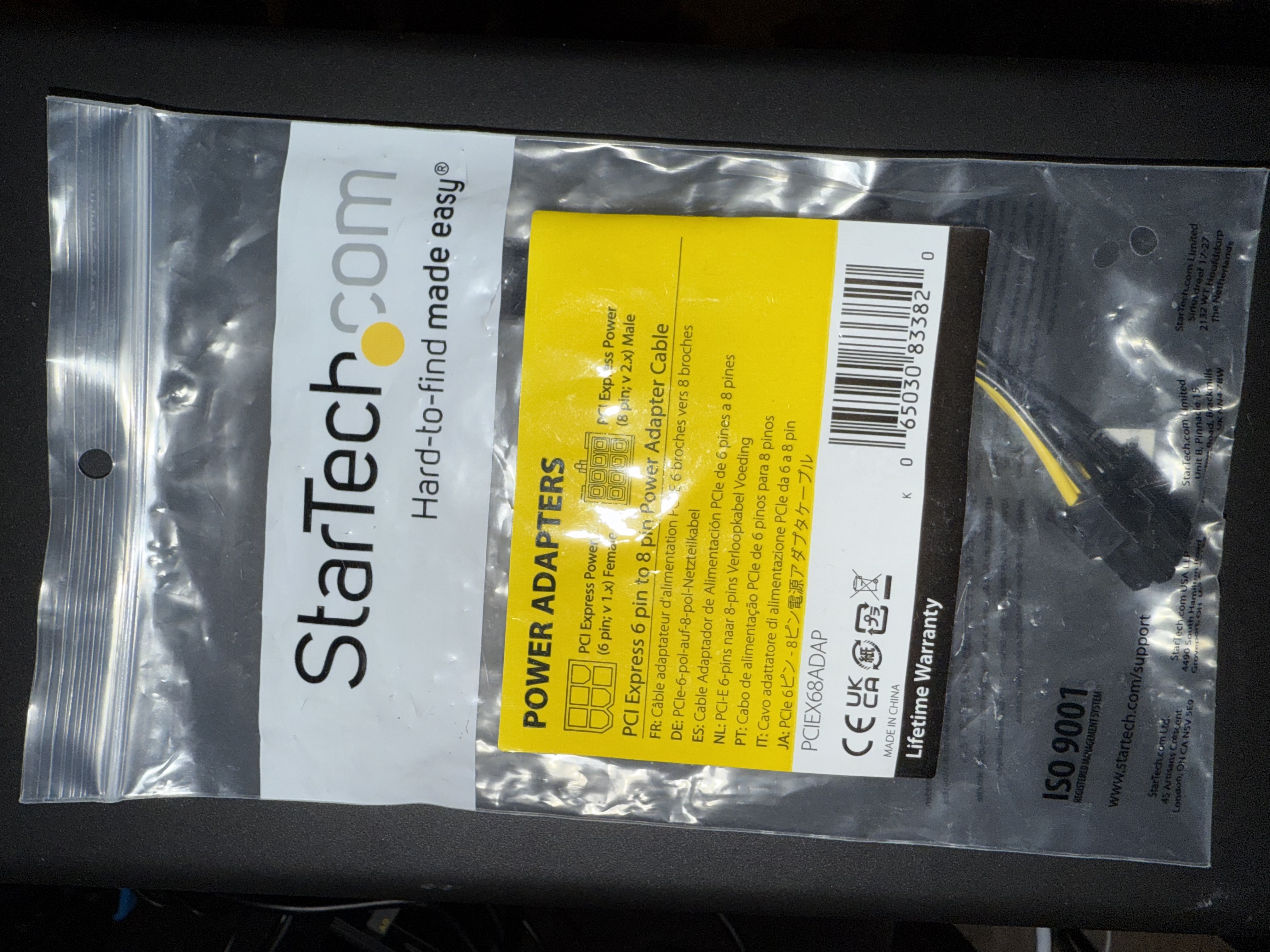 I got a miniDP cable so that I can get video out of the NVIDIA Quadro P1000 GPU. I plugged in a keyboard, started up the computer, and mashed F1 to get into BIOS settings. I didn’t see any obvious options in BIOS settings, so I think I need the proper OEM M6pin-M6+2pin cable.