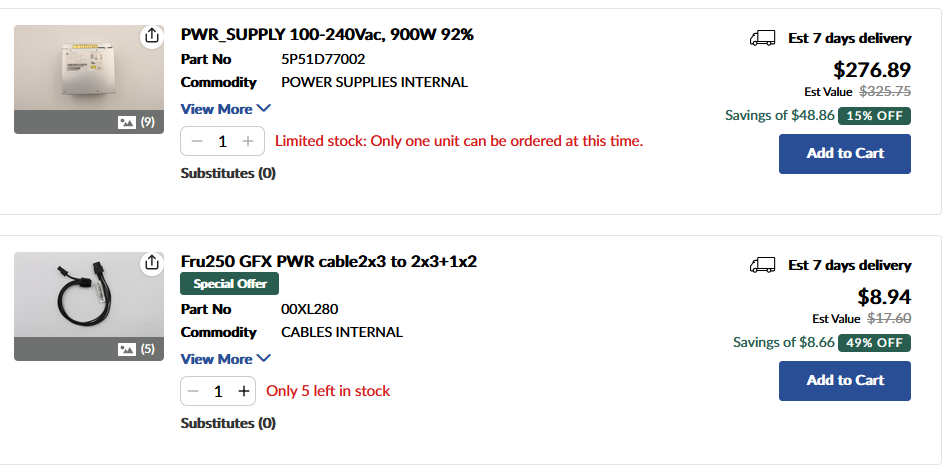 I looked on eBay and found the 900W PSU for $80 and the 1000W PSU for $108. Based on the P720 Power Configurator guide, the 900W PSU can drive a 250W graphics card and the 1000W PSU can drive a 300W graphics card. I’m worried the 900W PSU wouldn’t work out with my GPU that hits around ~280W, so I’ll accept the ~$30 price difference so that I don’t have to troubleshoot more. I went ahead and pulled the trigger on the 1000W PSU. I want to follow the “officially-supported” path even though the P720 has reached End of Development support.